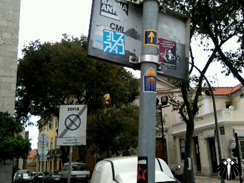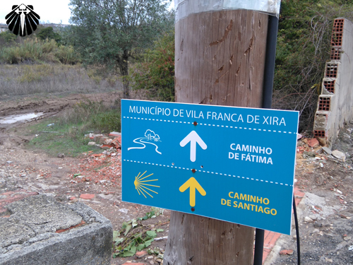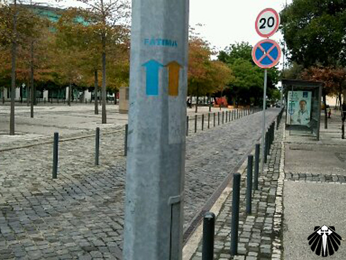 Para encontrar a primeira seta não é difícil, ela está localizada na esquina ao pé da Igreja, a direção a seguir é pela esquerda. Em alguns postes é possível ver adesivos com indicação do Caminho de Fátima e setas amarelas, na verdade o Caminho Português está muito bem sinalizado.
