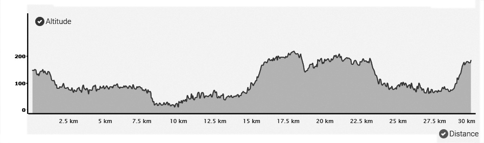 Feito o planejamento é só seguir as setas azuis sem medo de ser feliz, a etapa segue com as mesmas características das anteriores, longa demais, e agora aparecem os primeiros desníveis ou morros ao longo das etapas. Em certos momentos verás que são muitos, a perder de vista.