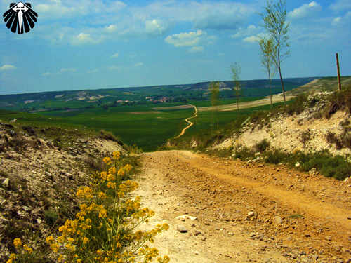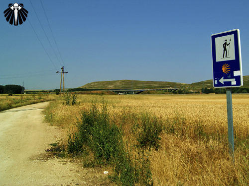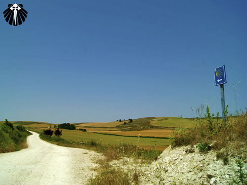 Nos limites da cidade o Caminho segue por uma estrada de terra. A partir deste ponto a paisagem muda completamente até Tardajos. As setas amarelas, o sol e a carretera serão os companheiros de caminhada até lá.