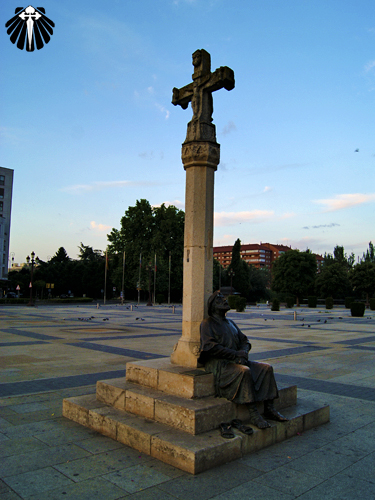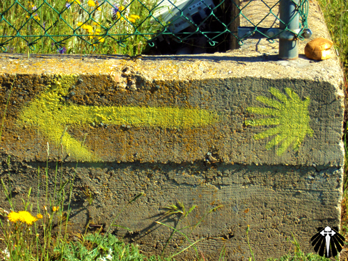 As setas amarelas passam em frente ao Santuário de la Virgen del Camino, com suas treze estátuas na fachada, representando os 12 apóstolos e a Virgem Maria.