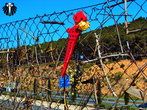 A trilha vai margeando a carretera e a tela de arame vai sendo ornamentada de cruzes deixadas pelos peregrinos que seguem pra Santiago.