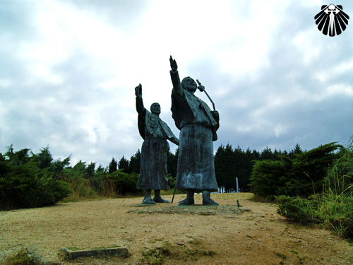 Antes de deixar o complexo de acolhida ao peregrino em Monte do Gozo, você não pode deixar de visitar o Miradoiro, onde duas estátuas de peregrinos apontam em direção a Catedral.