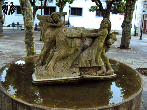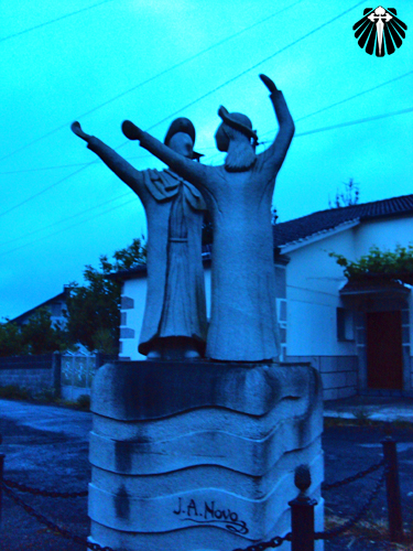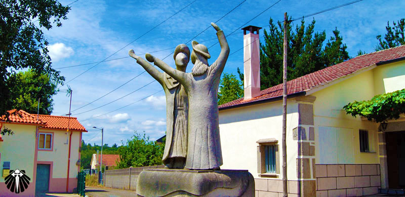 Uma estátua de peregrino, próximo ao albergue, indica o Caminho por onde seguir e uma outra escultura, agora de dois peregrinos dançando, é o local de despedida de Palas de Rei.