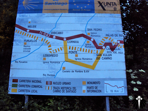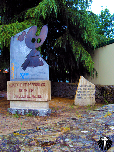 Saindo de Leboreiro por ponte medieval e seguindo pelo acostamento da carretera, encontra-se várias placas que listam os nomes dos Cavaleiros e Damas de Melide que já realizaram o Caminho de Santiago.