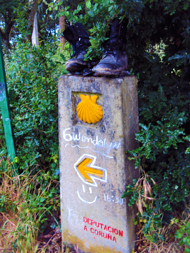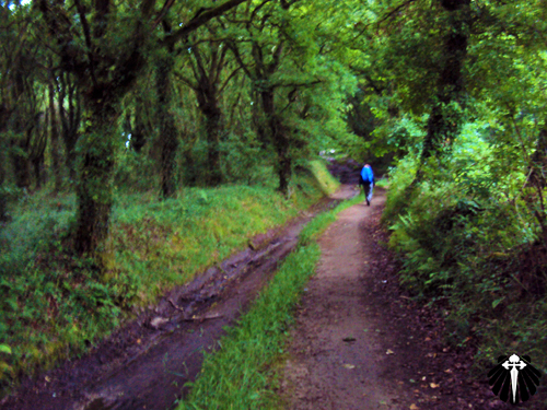 As setas por vezes seguem paralelas a carretera e por vezes entre trilhas abertas no bosque, onde o Caminho é rodeado de carvalhos centenários e eucaliptos novos.