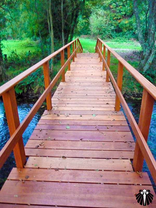 A trilha que segue entre o bosque de carvalhos se depara com uma ponte com cercado de madeira, que faz a travessia sob a rodovia nacional A-8, uma construção não muito usual nos Caminhos rumo à Santiago de Compostela.