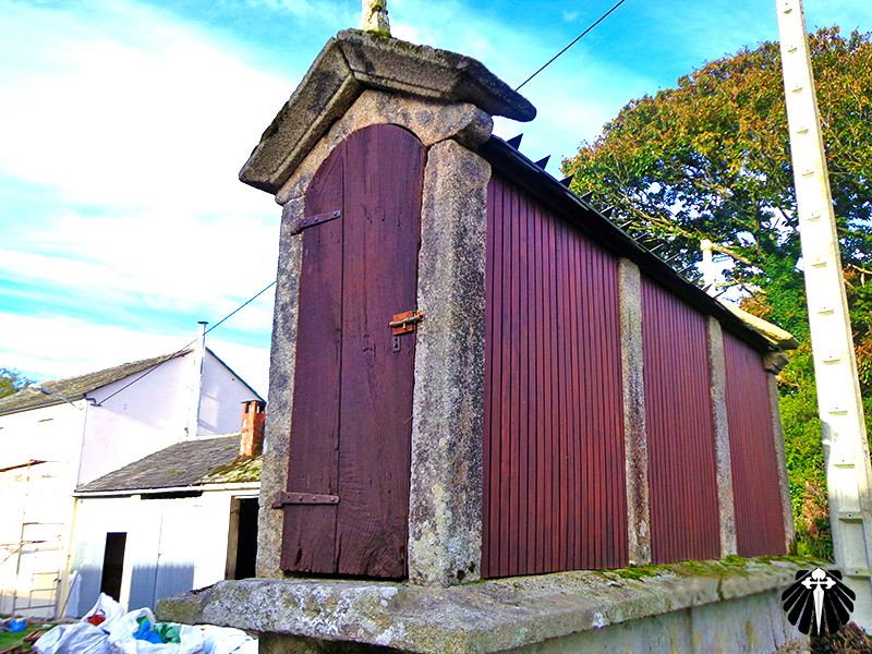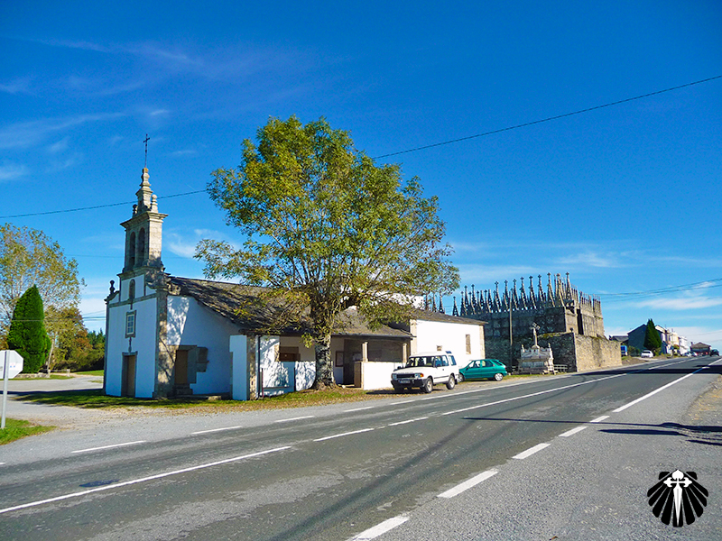 As setas amarelas seguem pela caarreteira local até a localidade de Goiriz, onde se encontra a Igreja de Santiago com cemitério característico anexo.