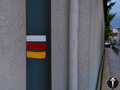 Logo em frente aos Bombeiros há uma pequena área de recreação esportiva onde o peregrino encontra um pequeno marco e setas indicativas, como o que se encontra no alto Leopold no Caminho Francês, mas creio que as setas estão apontadas para as direções incorretas.