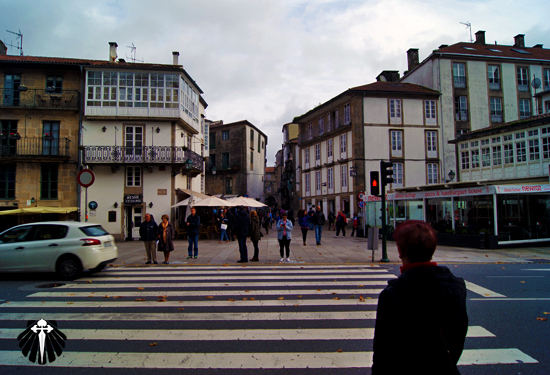 Aqui o peregrino deve tomar a Rua do Franco a esquerda em vez da Rua do Vilar, onde as setas indicam a direção. Indo por esse Caminho fica mais fácil chegar a Praça do Obradoiro.