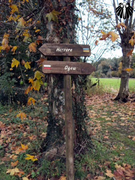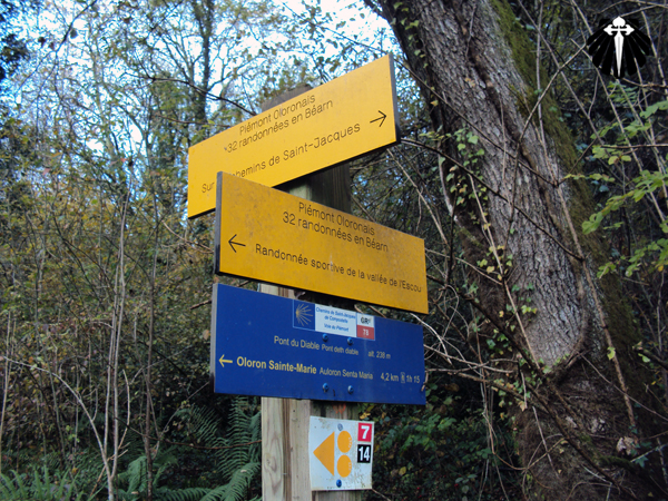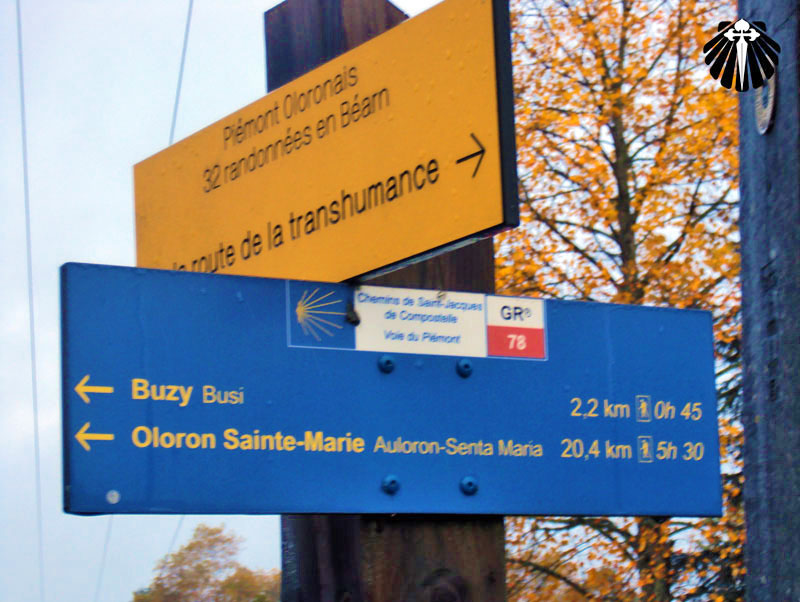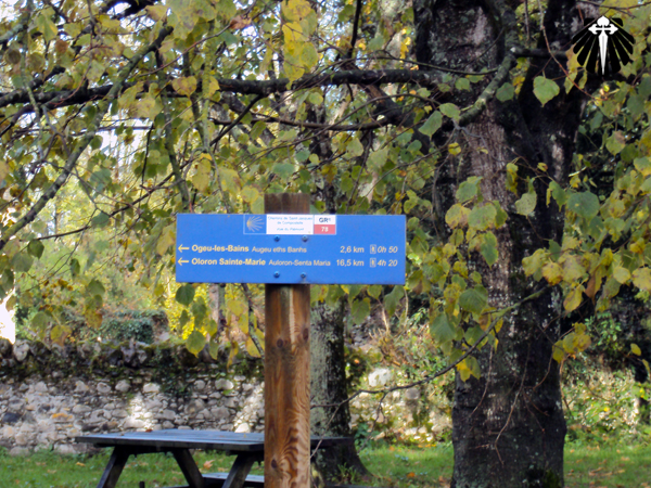 Não demora muito para a primeira setinha amarela aparecer e em seguida a indicação das placas azuis da GR-78 com distância a ser percorrida até Oloron Sainte-Marie.